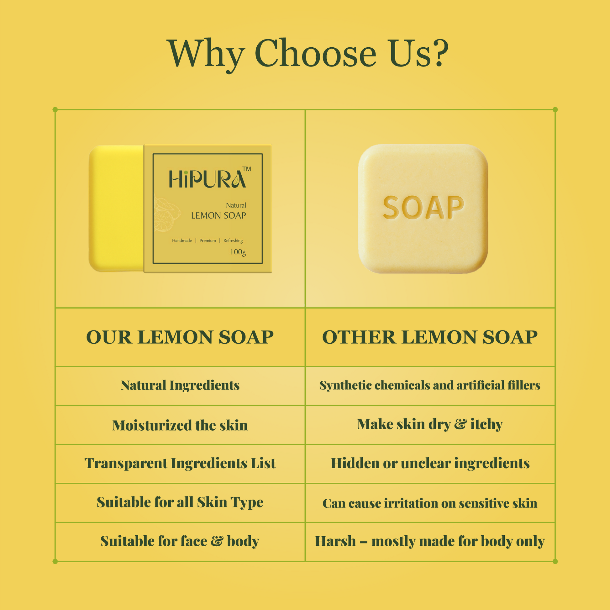 ๐ Brighten your skin naturally with HiPura Lemon Soap Pack of 5ย โ your daily dose of glow! Made with lemon powder and jaggery, this handmade soap helps fade dark spots, reduce dullness, and even out skin tone.